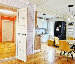 Общая площадь 131,1 м2 функциональной планировки: 4 изолированные комнаты (10,6+11,6+15,5+15,5м2), просторная кухня гостиная (34 м2) с печью камином. Кухня укомплектована всей необходимой техникой (посудомоечная и стиральная машинки, холодильник, СВЧ, духовой шкаф и варочная газовая панель). Санузел в доме.