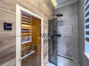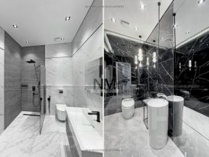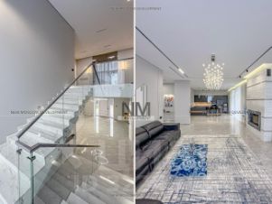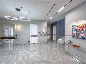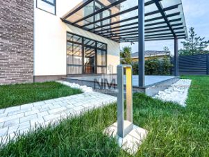 При отделке дома использовались натуральные материалы премиального качества: редкая полупрозрачная порода оникса с прожилками, мрамор, кварц, гранит для облицовки фасада цоколя, гипс, шпон экзотических пород древесины. Цветовая палитра выдержана в спокойных тонах, которые подчеркивают элегантность и изысканность пространства. Благодаря современному проекту в доме панорамное остекление (энергоэффективные окна Rehau), отопление дома осуществляется внутрипольными конвекторами KVVZ, настенными радиаторами Zehnder и группой дизайнерских радиаторов Loten Line V Black. Все коммуникации - центральные. Особое внимание в доме уделено: сердцу дома (итальянский качественный котел), климату (встроенная система канального кондиционирования), инженерным системам а также установлена уникальная американская система встроенный пылесос. Во всех комнатах трековое дизайнерское освещение, что позволяет осуществить полный контроль над светом и установить необходимое кол-во светильников разных цветовых температур.