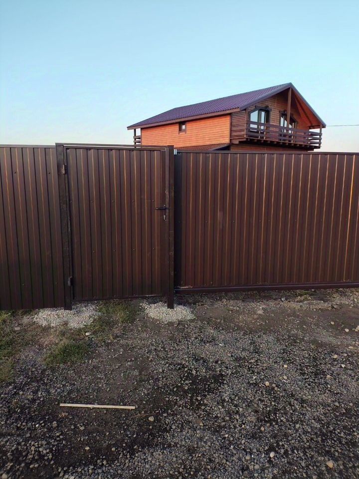 Установлен забор из качественного профнастила с откатными воротами 3,5 м. И калиткой с качественным итальянским замком.