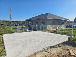 Ровный участок правильной формы. обнесен каркасом для будущего забора. Залиты площадка для парковочных мест, бетонная дорожка и отмостка.