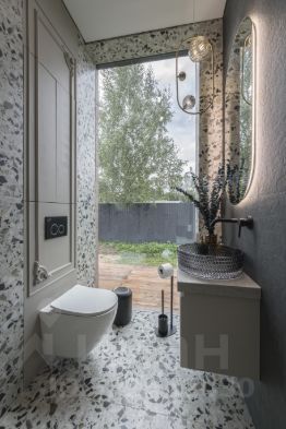 В отделке санузлов использован крупноформатный керамогранит, душевые системы и смесители скрытого монтажа, стильные навесные тумбы и дизайнерские накладные раковины, вертикальные полотенцесушители. Напольное покрытие: первый этаж - крупноформатный керамогранит, второй этаж - премиальный ламинат, повторяющий фактуру и цвет натурального дерева. Стены окрашены, использованы молдинги, декоративные панели. Лестница широкая, с удобным шагом, каркас выполнен из металла, ступени - дерево (покрыты лаком). Межкомнатные двери с алюминиевой кромкой.