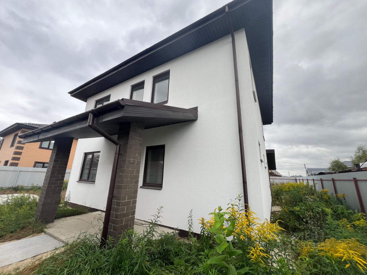 Дом - 2 этажа,, высота потолков обоих этажей 2,70 ,стены из газосиликатных блоков BONOLIT прочностью (D500), крыша выполнена из металлочерепицы ,потолок второго этажа утеплён минеральной ватой толщиной 200 мм, фундамент монолитная ж/б плита, перегородки комнат из газосиликатного блока, лестница из монолитного ж/б, окна ПВХ ( профиль 72 мм с наружной ламинацией цвета), входная дверь металлическая .Участок огорожен . Стены -обои.Электропроводка разведена. На первом этаже подключена система "тёплый пол", плюс - батареи отопления во всех помещениях, коммуникации заведены в дом (электричество 15 кВт, вода, канализация системы Топаз).Вода - своя скважина глубиной 38 м. Два санузла.