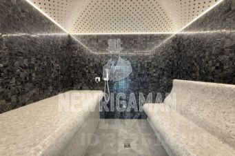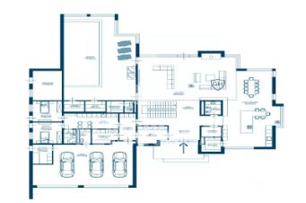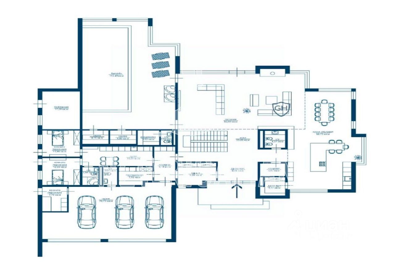 1 этаж - гостиная с камином и вторым светом, кухня-столовая с кладовой и выходом на участок, СПА- зона с бассейном, хамам, сауна, постирочная, гараж на 4 м/м, блок для персонала из 2 комнат и кухни, котельная с 3 котлами;