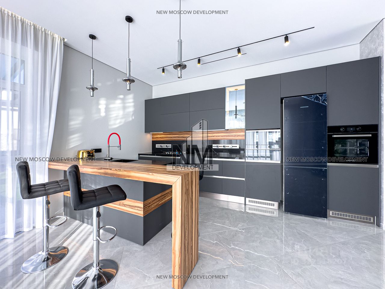Для внутренней отделки дома использовались дорогостоящие натуральные материалы - мрамор, керамическая плитка, гипс. Установлена современная кухонная мебель Giulia Novars | Элитные кухни, гарнитур немецкого бренда.