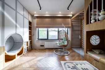 2 этаж: две мастер-спальни с гардеробными и ванными комнатами, кабинет, детская игровая комната, сделана по индивидуальному проекту с игровой зоной, детский санузел.