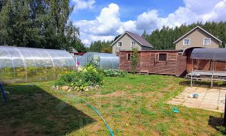 ухоженный участок 5,74 сот, с клумбами, грядками, 2 теплицы, бытовка с небольшим сарайчиком для птицы, баня, площадка под переносной бассейн, парковочное место, дренажная система вокруг дома.