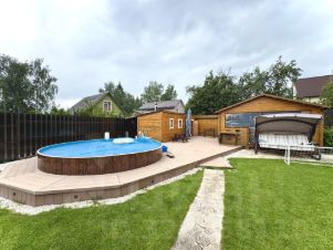 Выполнен ландшафтный дизайн. Организован дренаж с выводом дренажных вод в колодец. Распределенный автоматический полив газона, клумб, грядок и всех насаждений. На участке высажены малина, голубика, жимолость, плодовые и декоративные деревья.