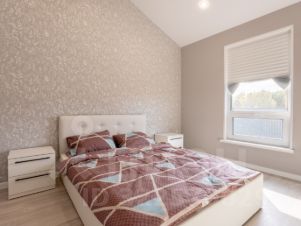 По планировке в доме три отдельных спальни, большая кухня-гостиная, совмещенный туалет с ванной, техпомещение, где установлена очистная система, теплый пол, кстати, на фреоне, кладовая комната.