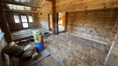 Перекрытия от фундамента к первому этажу - жб плиты, от первого этажа ко второму - балки 200х100 и 200 мм утеплитель Isover.