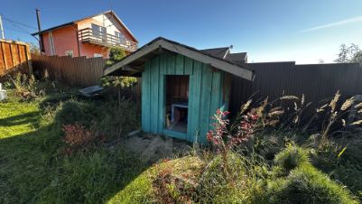 На участке есть детсткая площадка, большой батут, детский домик и высокие грядки. Также имеется контейнер под сарай.