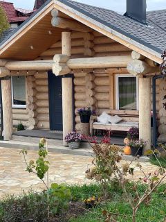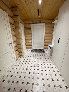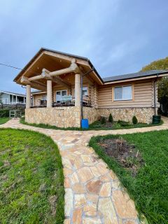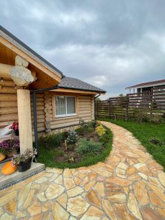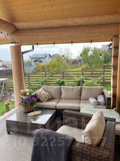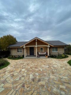 Общая площадь 151,6, крыльцо и большая веранда с выходом из кухни гостиной (40 кв.м.,), 4 спальни (16-18 кв.М.), 2 санузла, коридор, техническое помещение. Дом построен из бревна от 30 см диаметром, со стороны веранды и крыльца бревна увеличенного диаметра, что придает строению дополнительно красивый внешний вид.