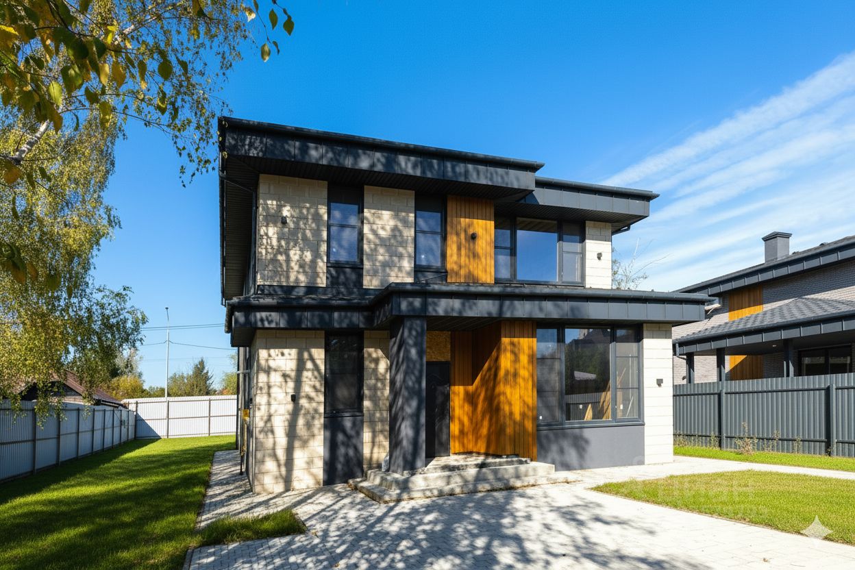 Стены: газобетонный блок (400 мм) Bonolit, фасад плитка под ригельный кирпич, планкен из натуральной лиственницы.
