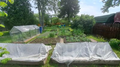 - плодовые деревья и кустарники, сделаны грядки под посадку, есть грядки с клубникой и земляникой, красивые цветы.