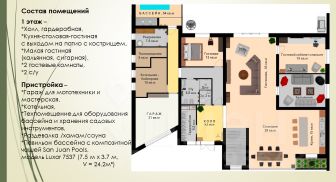 1 этаж- холл, гардеробная, кухня-столовая, гостиная с выходом на террасу к патио с кострищем, с/у, гардеробная, холл, котельная, техническое помещение, малая гостиная (кальянная), 2 спальни, 2 с/у.