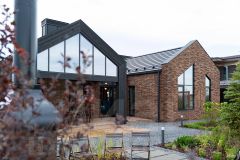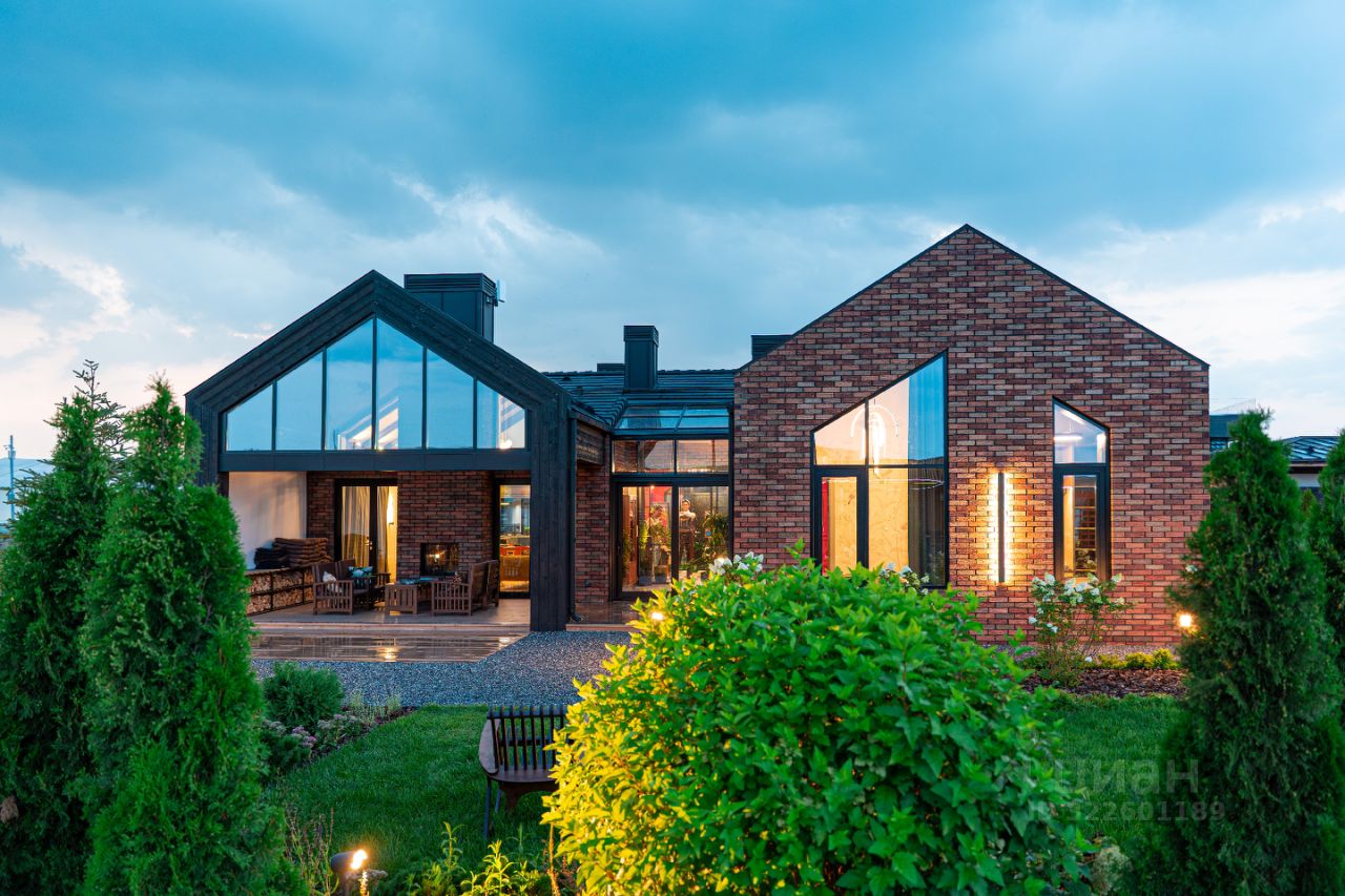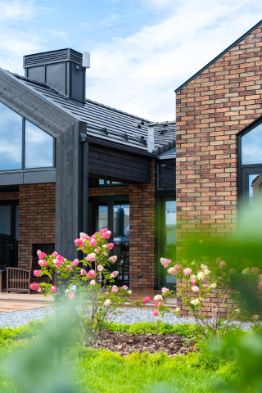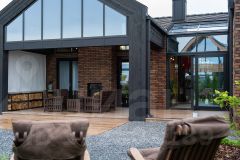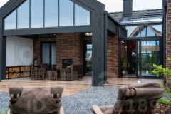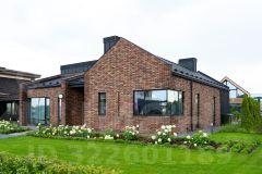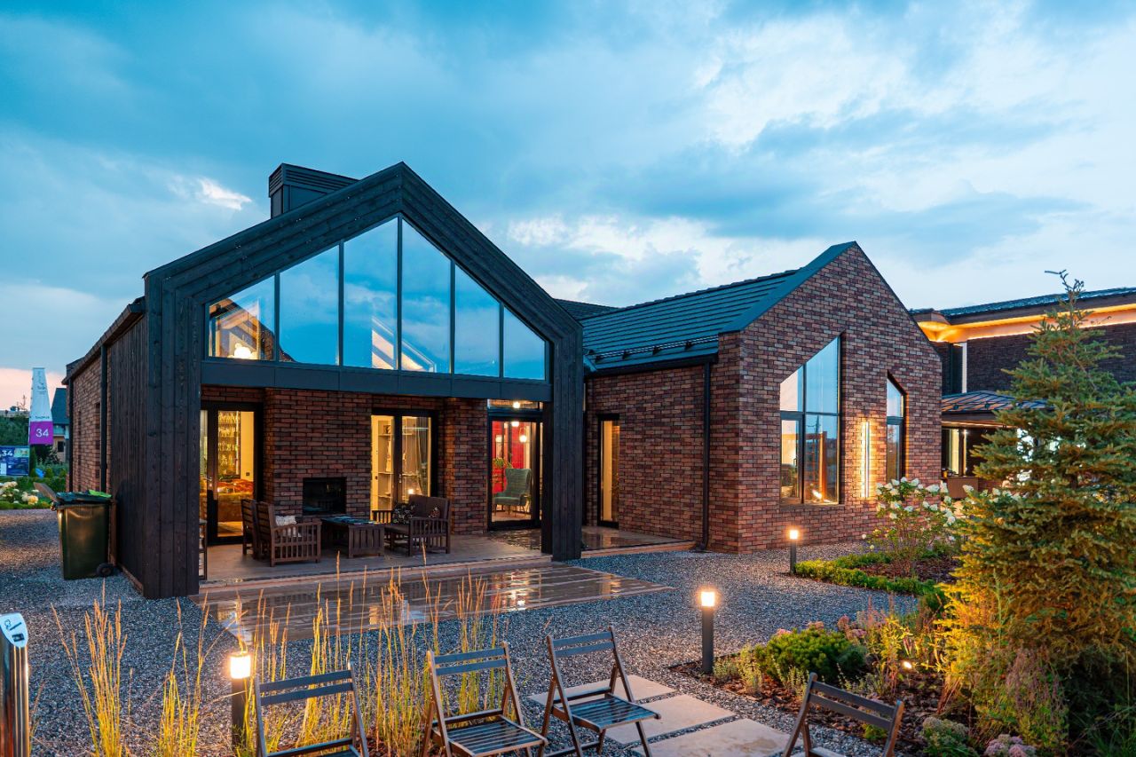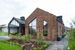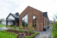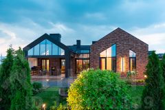 * Фасад: строгие геометрические формы и декоративная подсветка. Комбинирование дерева и кирпича подчеркивает сдержанную классику и утонченную английскую элегантность. Кровля из черной плоской черепицы и сложная геометрия окон придают дому современный вид и динамичные акценты.
