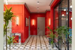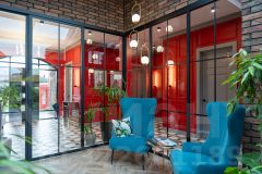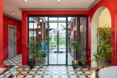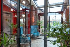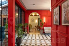 * Интерьерные решения: сердцем дома стал зимний сад, в котором расположены библиотека и камин. Здесь зелёные растения дополняют интерьер, придавая ему расслабляющую атмосферу.