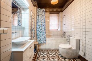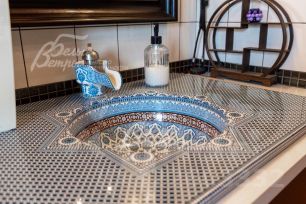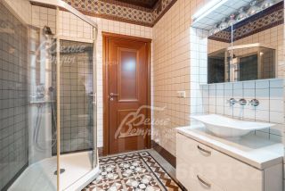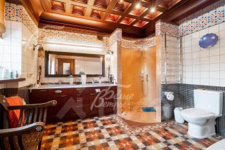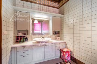 • Метлахская плитка в санузлах и кухне. Плитка на стенах в санузлах, душевая в мастер-спальне, фризы на фартуке кухни и камина, с использованием сусального золота, в санузлах фризы из марокканской плитки ручной работы.