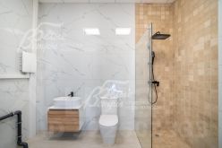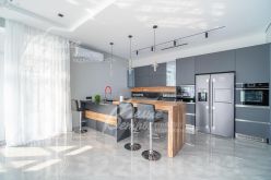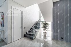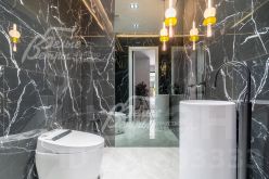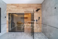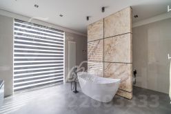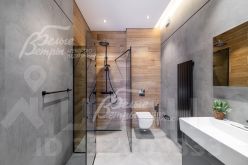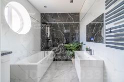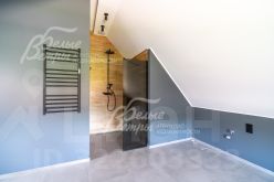 Описание внутренней отделки: в доме выполнен современный дизайнерский ремонт под ключ. На стенах декоративная венецианская штукатурка, премиальные обои, в санузлах керамогранит, в мастер-спальне и гостиной декоративные панно. На полу первого этажа широкоформатный керамогранит с водяным подогревом от газового котла (регулировка по зонам), пол в жилых комнатах - дубовая инженерная доска. Одна из стен холла отделана слэбом из натурального светло-светлого мрамора. Портал камина от пола до потолка и ступени лестницы отделаны натуральным черным мрамором. Потолки из гипсокартона с теневым профилем. Установлены внутрипольные конвекторы KVVZ, радиаторы Zehnder, дизайнерские радиаторы Loten Line V Black, прочные межкомнатные эмалированные двери высотой 240 см с дизайнерской стеклянной вставкой в стиле дома и чёрным алюминиевым профилем (UNION). На второй этаже ведёт железобетонная лестница с отделкой из натурального мрамора и стеклянным ограждением. Гардеробная в мастер-спальне зонирована стеклянной тонированной перегородкой. Студия на мансардном этаже оформлена в стиле лофт. Чаша бассейна отделана натуральной мозаикой, в сауне - вставки из гималайской соли, панорамное остекление с красивыми видами на бассейн.
