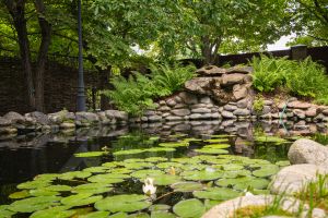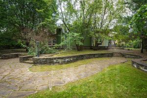 Ровный участок логической формы, огорожен забором на бетонном основании. Растет множество хвойных и лиственных деревьев. Декоративный пруд с карасями. Дорожки и парковка вымощены брусчаткой, смонтировано уличное освещение. Деревянная баня и летняя беседка.