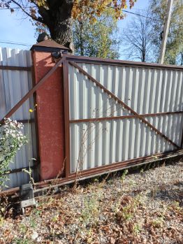 Площадка перед двором засыпана щебнем. Двое ворот, одни автоматические (открываются с пульта), вторые распашные.