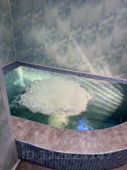 Также имеется двухэтажный гостевой дом с парилкой и бассейном-джакузи. Гостевой дом выполнен из бревна, обшит сайдингом.
