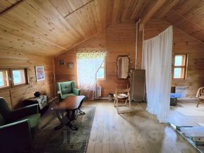 Пространство второго этажа не разделено перегородками, есть обустроенная полками большая кладовая, высокие потолки.