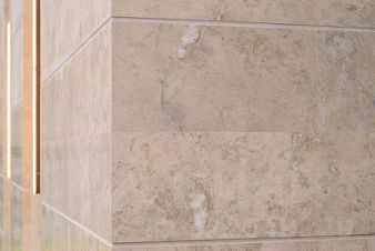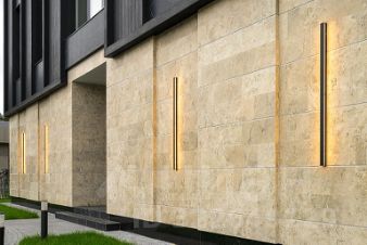 Фасадное оформление выполнено с использованием натуральных материалов, подчеркивающих индивидуальность и элегантность здания: первый этаж - натуральный камень доломит с кварцевыми включениями, второй этаж - широкоформатный керамогранит и планкен из минерального композита.
