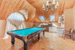В мансардном этаже спальня, кухня-бар, бильярдная, санузел. На первом этаже гараж - отапливаемый на 2 автомобиля, прихожая, подсобные помещения.