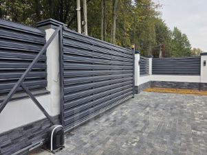 - Монолитная лента забора (250 мм) с отделкой декоративным камнем