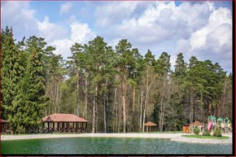Озеро с чистой водой и пляжем с белоснежным песком, где вы найдете зонты, шезлонги, кресла-мешки, кабинки для переодевания и уютные беседки для барбекю.