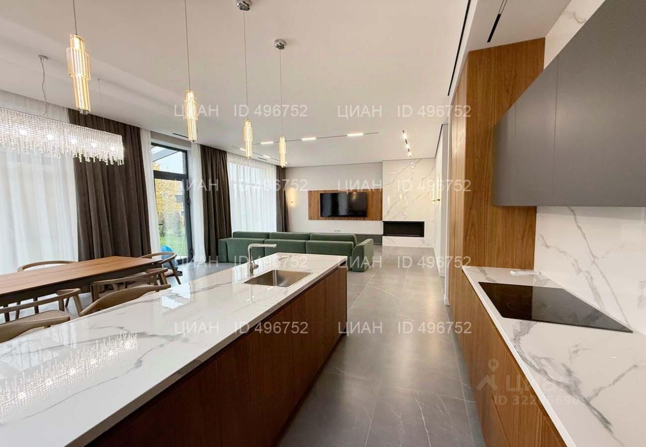 Высота потолка первого этажа 3,3 м. Площадь Гостиная-столовая-кухня более 70 метров.