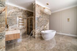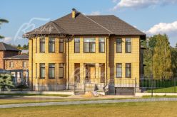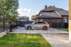 Описание внутренней отделки: интерьер дома оформлен в современном стиле ар-деко в светло-бежевой цветовой гамме. Стены покрашены элитной краской Little Greene (Великобритания) бежевых, дымчато-мятных и других пастельных оттенков, декорированы малярным стеклохолстом "Паутинка Oscar 25", молдингами, у изголовья кроватей 3D-панелями Decor Dizayn из полистирола высокой плотности, стены отделаны полиуретановым плинтусом белого цвета, прочными карнизами из дюрополимера Orac (Бельгия). На полу в гостиной (столовой и кухне) комбинация керамогранита Porcelanosa Massa Brillo: глянцевый, имитирующий белый мрамор с коричневыми прожилками, и чёрный с белыми прожилками, а также крупноформатный керамогранит Carrara Blanco Brillo; в жилых комнатах инженерная доска Дуб Селект (без сучков). Потолки из двухслойного влагостойкого гипсокартона. Установлены: биметаллические радиаторы Rifar и трубчатые радиаторы Arbonia; выключатели и розетки белого цвета, глянцевые и матовые, Werkel (Германия); премиальные межкомнатные филёнчатые двери молочного цвета М-Стиль из массива сосны высотой 2,3 м, выполненные по индивидуальному заказу (фурнитура - Armadillo (Италия) и Koblenz); дорогостоящая входная стальная дверь с терморазрывом с двухкамерными стеклопакетами по бокам и вверху, отделанная дубом, входной портал 173293 см; мраморные подоконники Imperador Light и Nero Marquina (Испания). На второй этаж ведёт лестница на бетонном каркасе со ступенями, облицованными изысканным натуральным мрамором Nero Marquina (Испания) чёрного оттенка (без примесей) с белоснежными прожилками, ступени с подсветкой, ограждение из стали с поручнями чёрного цвета с золотым декором. Под плиткой тёплые полы. Электропроводка проведена в соответствии с требованиями ГОСТ, кабель - Concord ВВГ НГ ЛС. Смонтированы автоматические выключатели ABB, наружные коллекторные шкафы FAR и Oventrop, проложены трубы из сшитого полиэтилена Rehau. Лестница на улице с гранитными ступенями Bidasar Brown (Индия).