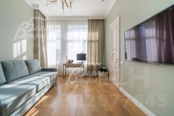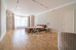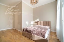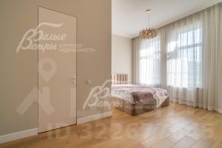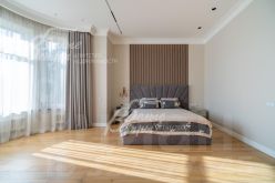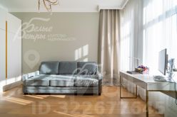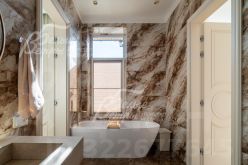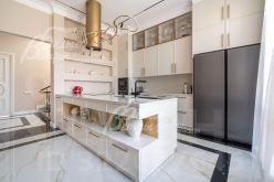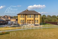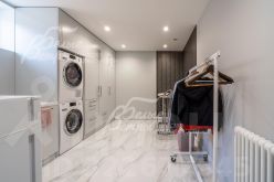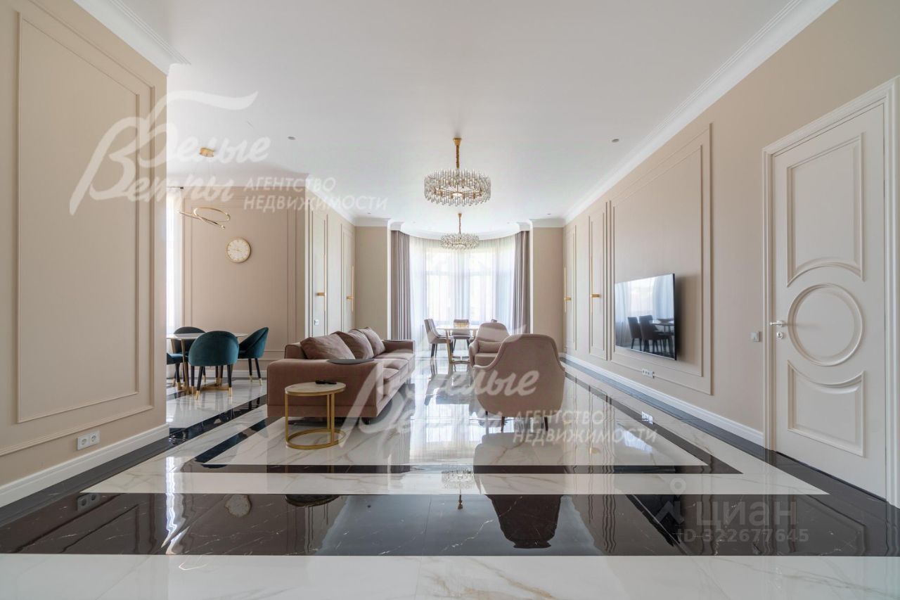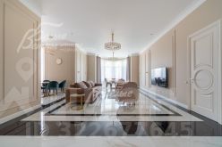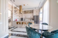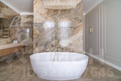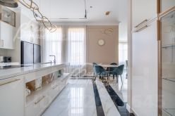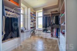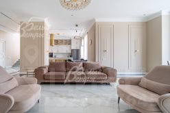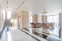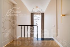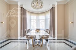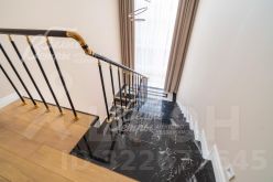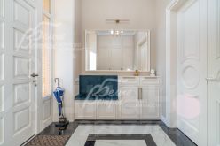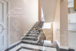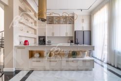 Мебель, оборудование: в прихожей корпусная мебель (шкаф, комод, банкетка) М-Стиль. На кухне гарнитур в классическом стиле с фасадами МДФ молочного цвета (итальянская краска) с золотистыми ручками (фурнитура Blum) с островом 31 м, столешница и фартук из кварцевого агломерата, холодильник Side by Side Liebherr, встроенная техника Neff. Окна декорированы тюлем и шторами. Выполнена система многоуровневого освещения, сочетающая элементы ар-деко и современного дизайна, с использованием осветительных приборов Newport (США): люстры, бра, световые линии на 2-м этаже. В постирочной стиральная и сушильная машины Miele. В санузлах установлена сантехника известных брендов: премиальные ванны из литьевого мрамора Salini (Италия), тропические души скрытого монтажа, унитазы с инсталляцией, электрические полотенцесушители, раковины из керамики и кварцевого агломерата.