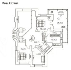 2 этаж 123,3 кв. м.: мастер спальня с функциональной гардеробной и ванной комнатой, из спальни выход в отапливаемый зимний сад 29 кв.м. с панорамным остеклением, 2 гостевые спальни, ванная комната с санузлом;
