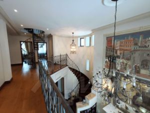 Дом оснащён системами кондиционирования (Daikin) и приточно-вытяжной вентиляции, водоочистки (RainSoft, США); видеонаблюдение по все периметру и внутри дома. На полу испанская плитка с теплым полом. Межкомнатные итальянские двери; трех камерные деревянные немецкие окна; дровяной камин выполнен из Каррарского мрамора; перила и лестница второго, третьего этажа художественная ковка ручной работы. Автономное регулирование температуры во всех помещениях с собственной терморегуляцией.