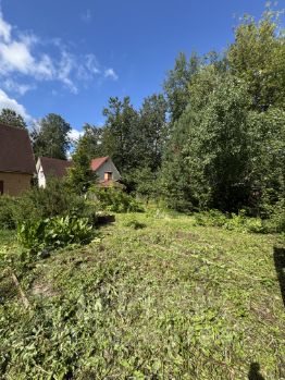 На земельном участке имеется кирпичная мангальная зона (с раковиной, отдельным местом под казан и также газовой плитой), беседка, дровница, фруктовые большие деревья (черешня крупная), ели, цветы. А также много свободного пространства для полета фантазии (например: огород, теплицы, бассейн, детская площадка) все это можно уместить. Соседей смежным нет, только через дорогу.