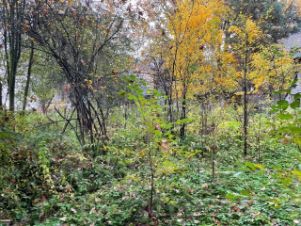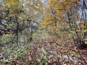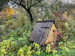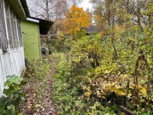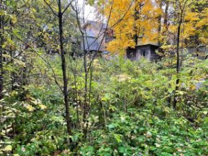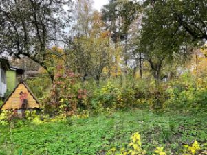 Участок с взрослыми деревьями, много плодоносящих яблонь и кустарников.