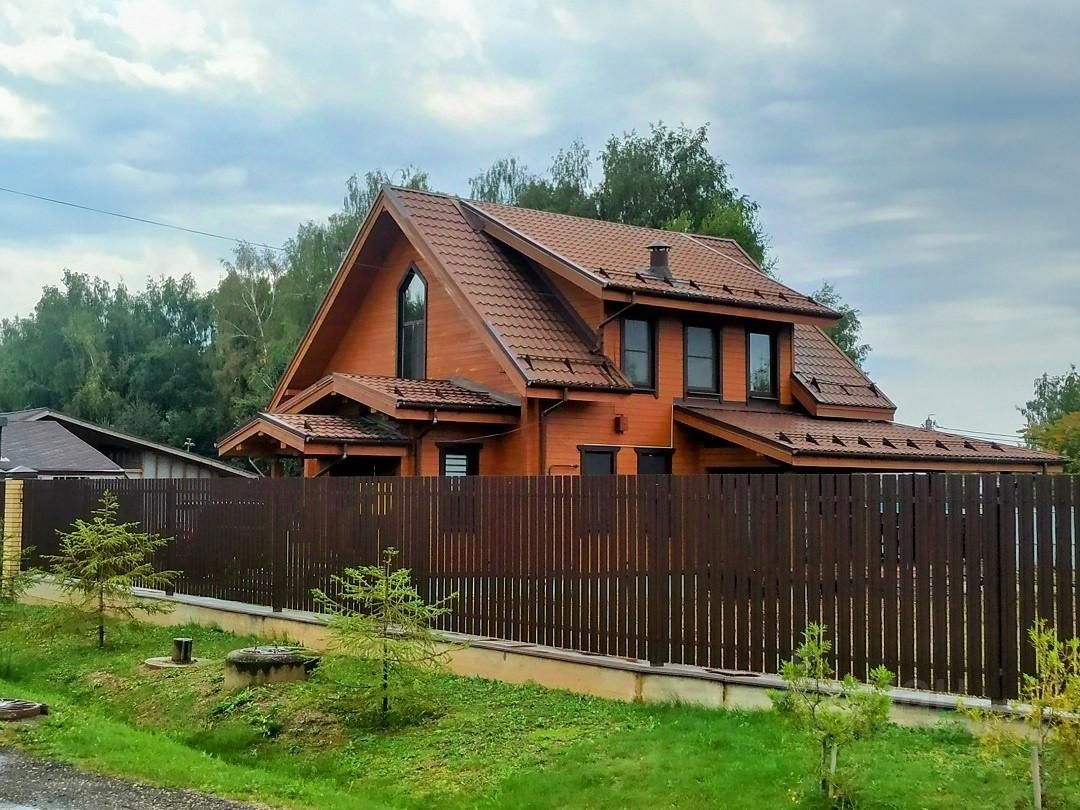 На монолитной плите дом из КЛЕЕНОГО БРУСА, на крыше металлочерепица.
