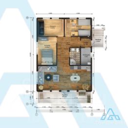 В доме кухня-гостиная площадью 34 кв. м с выходом на террасу 26 кв. м, три комнаты 12 кв. м, 12 кв. м и 14 кв. м, а также санузел, техническое помещение, холл и тамбур.