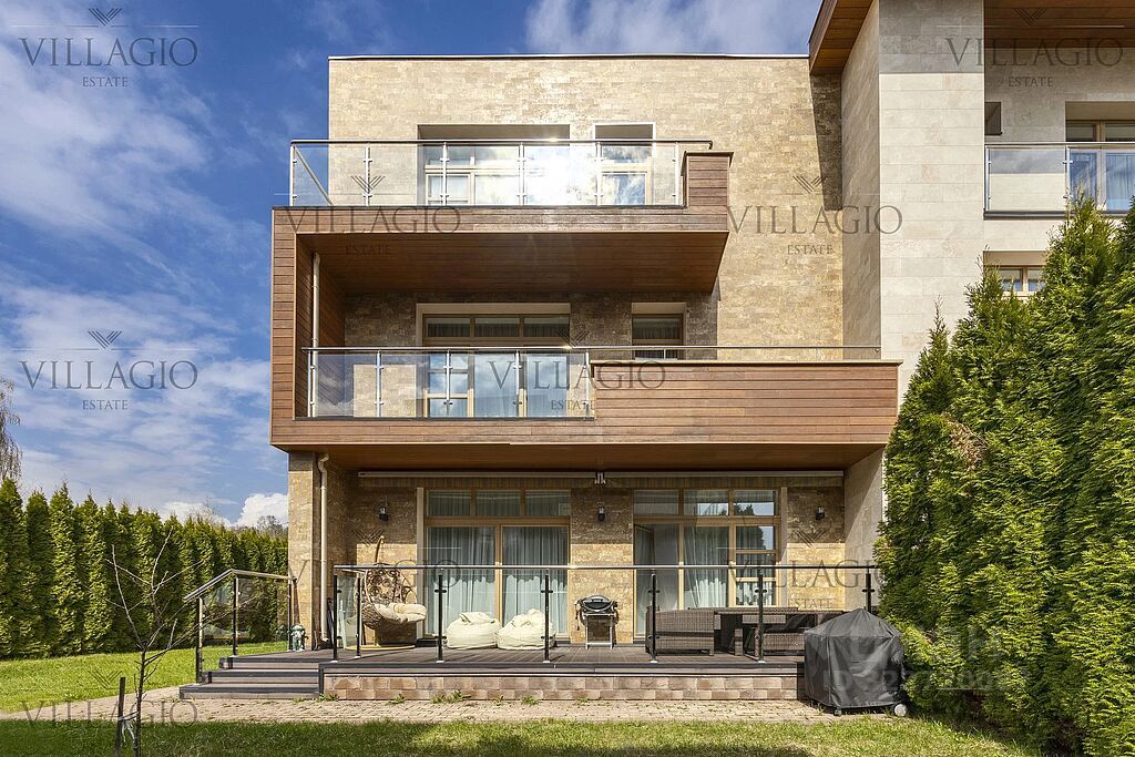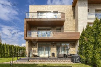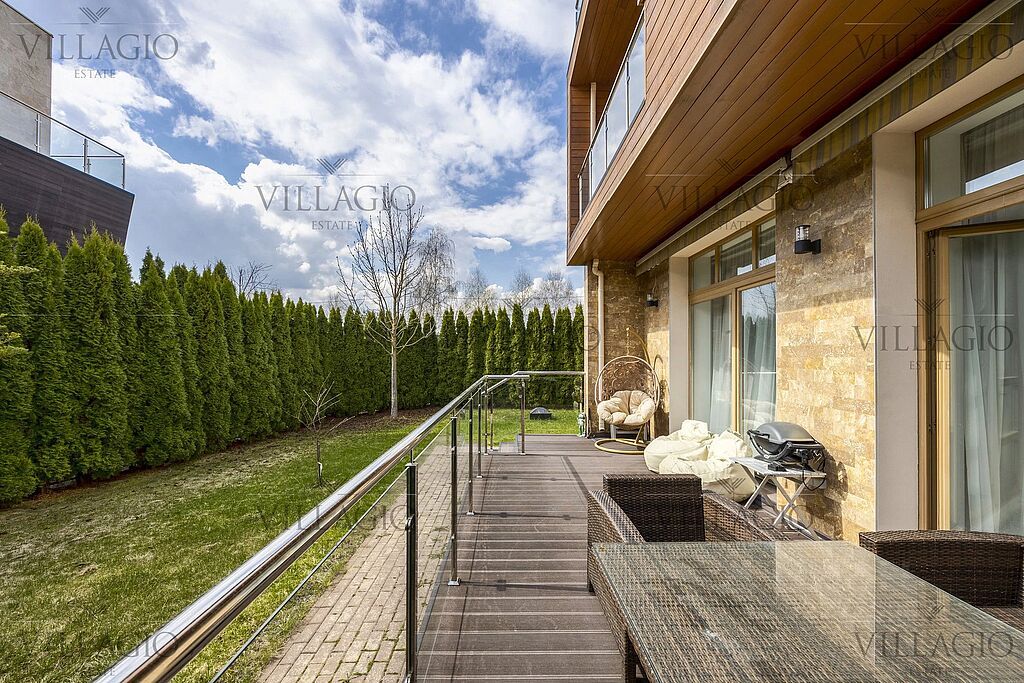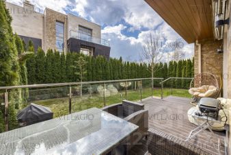 Таунхаус расположен на светлом участке площадью 5 соток с газоном, многолетними туями, приватной террасой.