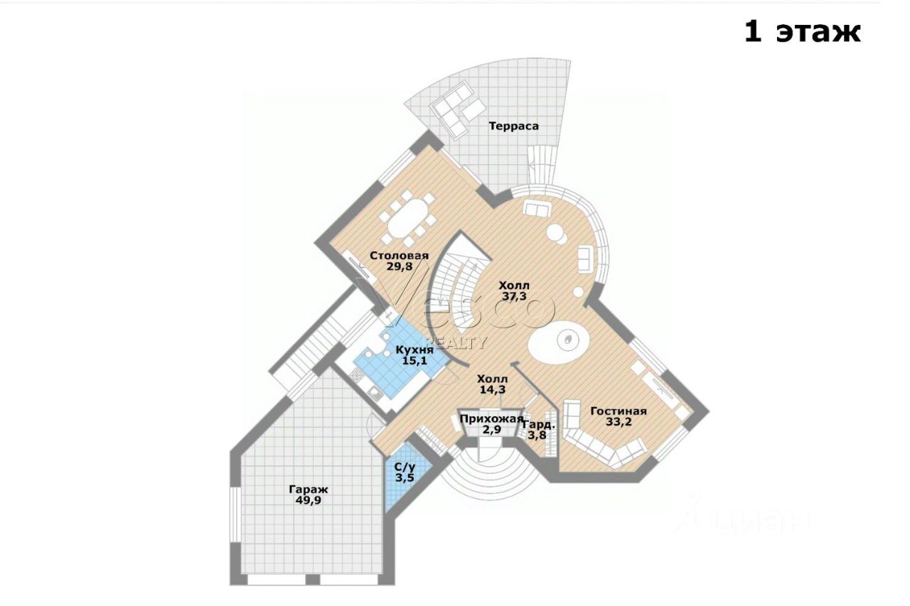 1 этаж: прихожая (2,9), входная зона (7,4), гардеробные (3,8 и 6,9), холл (37,3), гостиная (33,2), кухня (15,1), столовая (29,8) с выходом на террасу (30), гостевой с/у (3,5), гараж на 2 м/м (49,9).