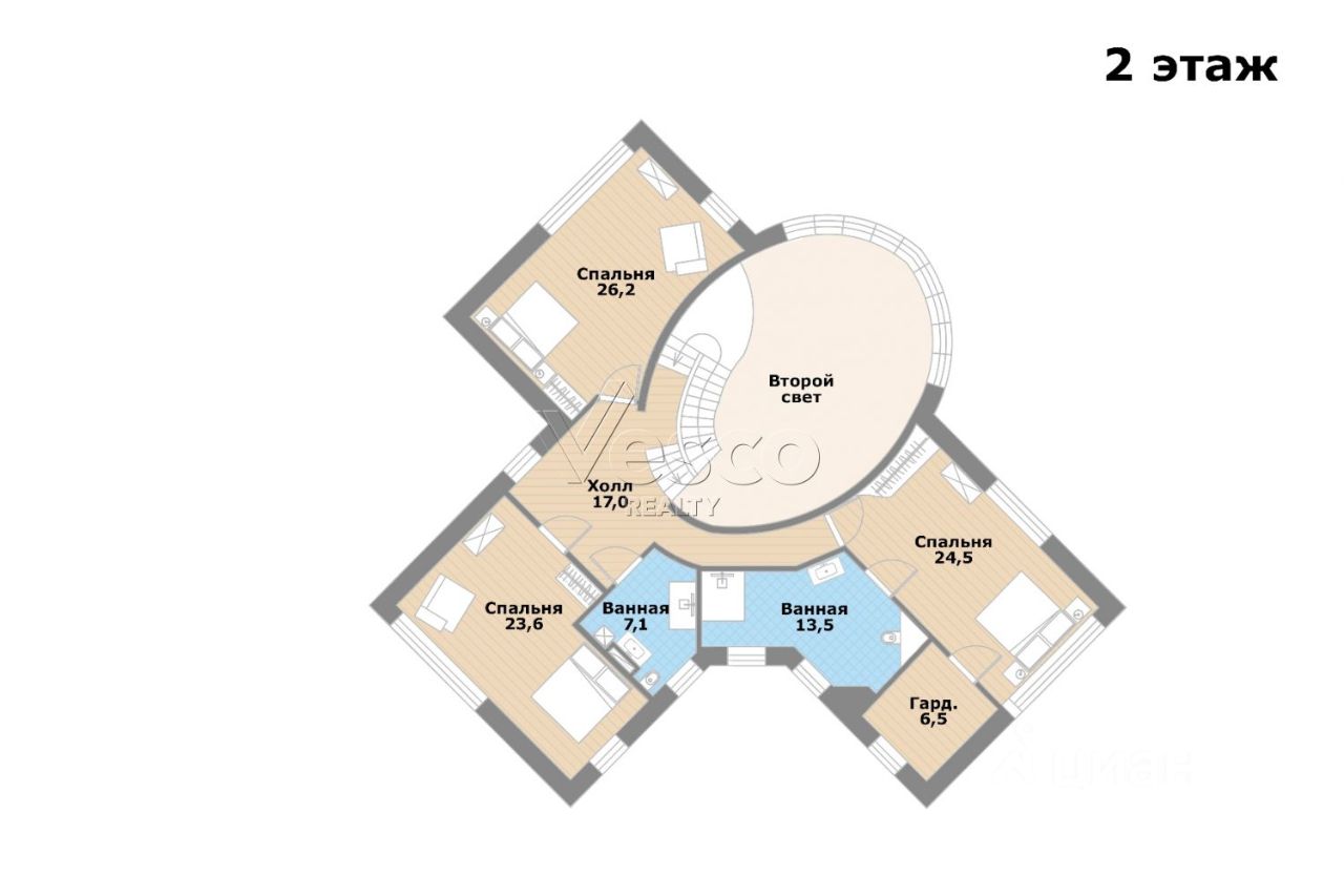 2 этаж: холл (17,0), мастер-спальня (24,5) с ванной (13,5) и гардеробной (6,5), детские (26,2 и 23,6) с общей ванной (7,1).