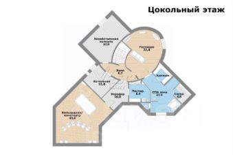 Цоколь: спа-зона (27,4), хаммам (4,6), сауна (4,6), гостиная (32,8), бильярдная-кинотеатр (49,9), холл (8,7), котельная (12,8), постирочная (8,6), коридор (10,9), хозяйственная комната (27,0).