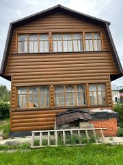 Дом 2011 года постройки, строили для себя, материал стен — дерево (сруб), терраса — брус. Фундамент — ленточный, терраса — блочный. Крыша — металлочерепица. Электричество — 10- квт, колодец — 12 колец.