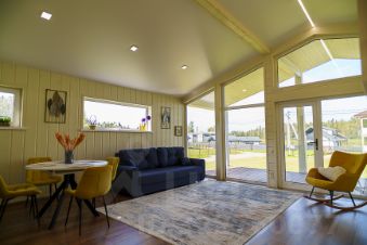 В доме гостиная с кухней 35 м, 3 спальни 10+11+12 м, большой с/у отделан плиткой, предусмотрено место для стиральной машины.