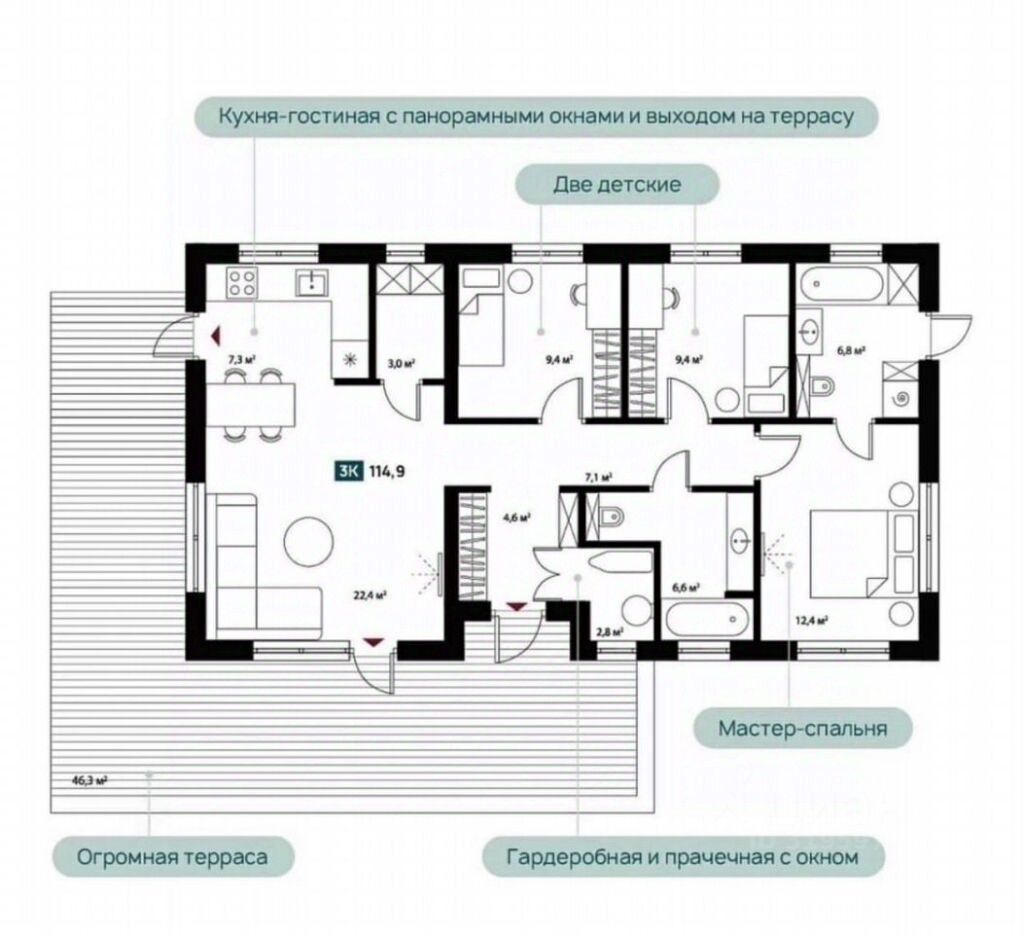 — Площадь 115 м², всё в одном уровне — удобно для семьи с детьми и старшими родственниками
