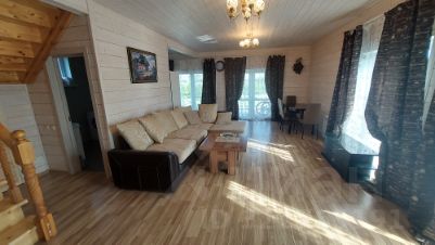 Дом построен по каркасной технологии площадью 129 кв.м., утепление зима, внешне отделан блокхаусом. На 1 этаже прихожая, просторная гостиная с выходом на террасу 15 кв.метров , кухня-столовая , спальня для гостей, санузел и бойлерная. На 2 этаже игровая зона для детей , 2 спальни и санузел. Дом полностью меблирован и оборудован всей необходимой техникой для комфортного проживания в нем. Фундамент ленточный монолит, окна стеклопакеты, крыша мягкая черепица. Перед домом плиткой выложена площадка для парковки автомобилей. Со стороны террасы организована площадка для барбекю.