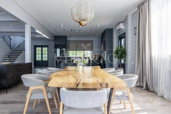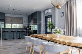 Внутренняя отделка выполнена с использованием премиальных натуральных материалов в спокойных нейтральных тонах. Дом укомплектован дизайнерской мебелью и техников премиальных брендов. Вся кухонная техника - KitchenAid, прачечная - Miele.