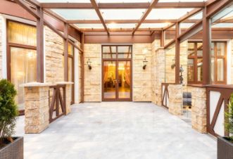 Фасад дома облицован натуральным бежевым камнем в сочетании со светлой штукатуркой и коричневым металлическим фахверком.