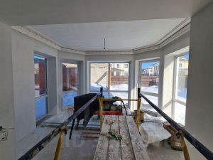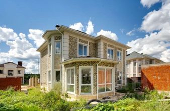 Жилая комната на 1-м этаже, кухня-столовая, каминный зал, выход на участок, на 2-м этаже 3 спальные комнаты со своими с/у и гардеробными.
